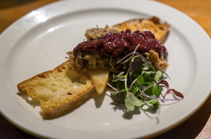 Процедить жидкость с черешней. Отлить 1/4 чашки, черешню крупно нарезать. Добавить черешню и 2 чайные ложки жидкости к утиному мясу и перемешать. По вкусу приправить с солью и перцем. Выложить ложку смеси на багет, добавить утиную кожицу и по желанию ложку черничного джема.