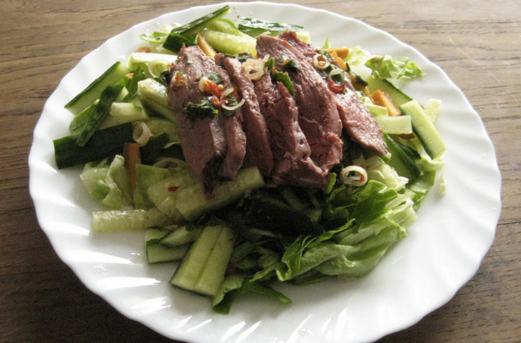 Утку приправить солью и перцем и обжарить на сковороде до прожарки medium или по вкусу. Дать отдохнуть 5-10 минут и нарезать небольшими кусочками. Мелко нарезать морковь, огурец, нарезать салат-латук. Смешать в миске чеснок, масло, рыбный соус, лимонный сок, имбирь и сахар. Выложить на тарелку овощи, сверху утиное мясо, полить дрессингом и подавать