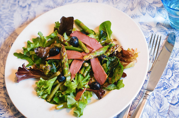 В миску выложить фризе или салатные листья, разрезанную спаржу, 1/4 чашки арахиса и дрессинг по вкусу. Разделить салат по тарелкам. Добавить в каждую кусочки утки, базилик, зеленый лук, оставшийся арахис и еще немного дрессинга.