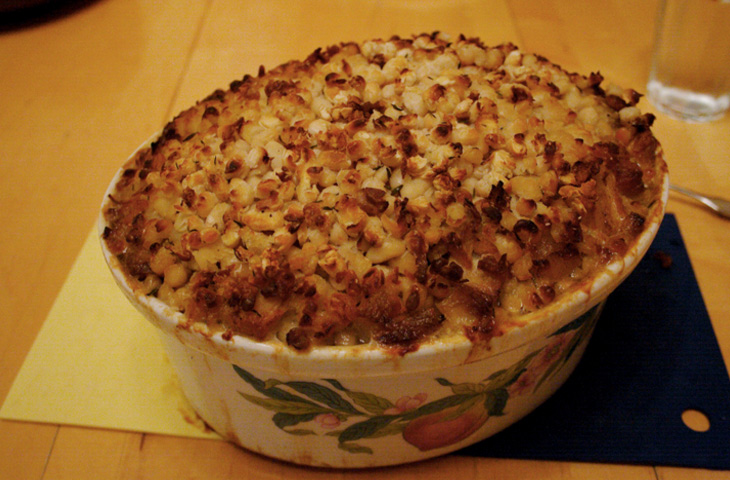 Переложить все в кассероль. Смешать панировочные сухари и петрушку в маленькой миске и посыпать ими блюдо. Полить маслом. Выпекать в течение 1 часа. Увеличить огонь до 260 °C и продолжать выпекать до образования корочки, около 5 минут.