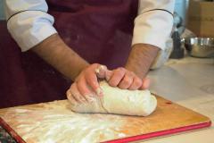 Разделить тесто на 4 одинаковых куска, и раскатать скалкой высотой 2 см, затем разрезать их пополам, чтобы получились длинные колбаски. В большом количестве муки, нарезать колбаски на биточки шириной 2 см.