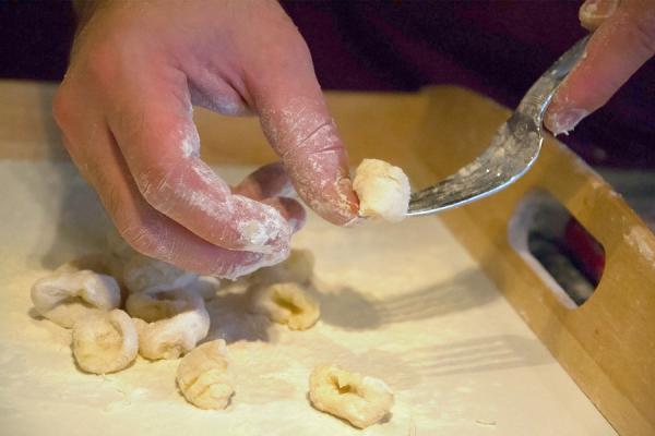 Вилкой придать классическую форму «Ньокки»: закрутить биточки на зубцах вилки, как бы прокатывая их по ним.