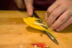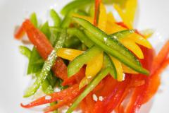 Нарезать перец соломкой, а помидоры черри на четвертинки.