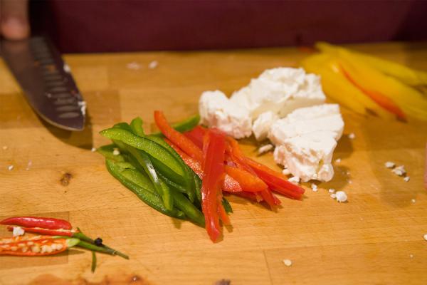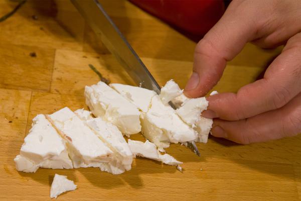 Нарезать сыр фета кубиками. Чтобы фета не прилипала к ножу, нож следует помыть в горячей воде, и нарезать теплым ножом.