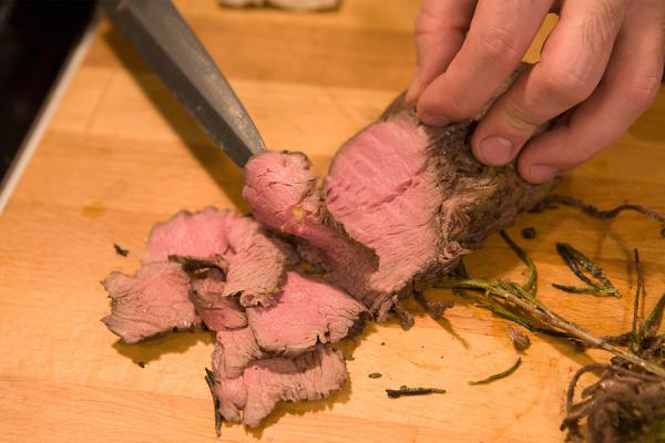 Достать филе из духовки, закрыть фольгой и остужать в течение 10 минут при комнатной температуре. Затем нарезать очень тонкими ломтиками, как на слайсере.