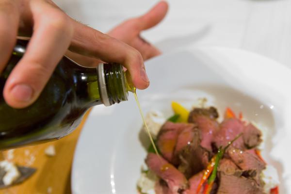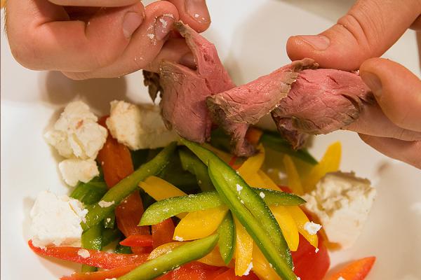 Филе говядины обмотать натуральной веревкой, посолить и поперчить. Полить оливковым маслом и выложить вместе с травами и чесноком на противень. Запекать в духовке при 200 С (390 F) в течение 20-25 минут. Помыть и очистить все овощи.