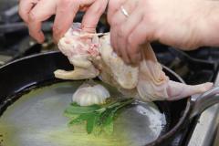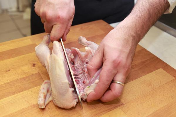 Разрезать цыпленка по брюшной стороне.