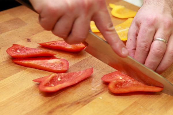 Очистить лук и болгарский перец, затем нарезать. Головку чеснока разрезать поперек, как на фото. Стручковый перец разрезать вдоль.