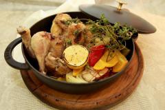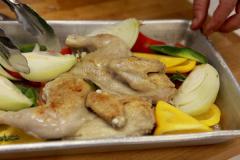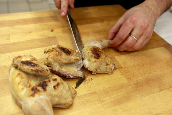 Разрезать готового цыпленка на порции.
