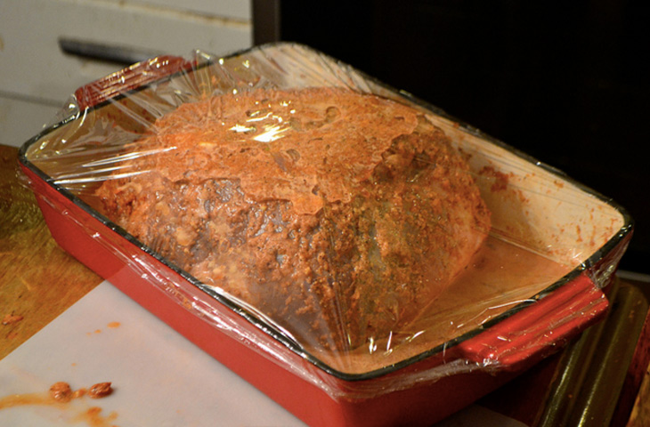 Большие отрубы мяса и целая птица требуют особого подхода. Стихийность и спонтанность здесь вам не помощник. Гораздо эффективнее с большими кусками мяса работает четкий план действий. Приготовление этих частей необходимо планировать заранее. По большей части это связано с их размерами. Специи и приправы, добавленные непосредственно перед запеканием, просто-напросто не успеют передать большим частям туши свой аромат. Солью, перцем и набором любимых приправ знающие люди советуют натирать мясо заранее, вечером накануне приготовления. В раскрытом виде сдобренное приправами мясо необходимо положить на поднос и оставить в холодильнике до следующего дня. Ночи будет вполне достаточно, чтобы мясо пропиталось запахом специй.