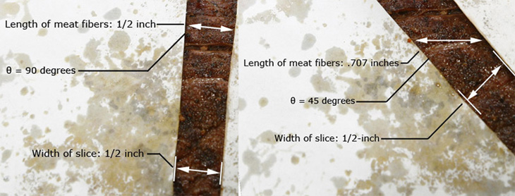 И чтобы довести ситуацию до абсурда, представим, что нам нужно разрезать мясо параллельно волокнам. В таком случае, sin(θ) будет равняться нулю, и, согласно нерушимым законам математики, длина волокон вашего стейка будет простираться прямиком в бесконечность, что, безусловно, затруднит его поедание.