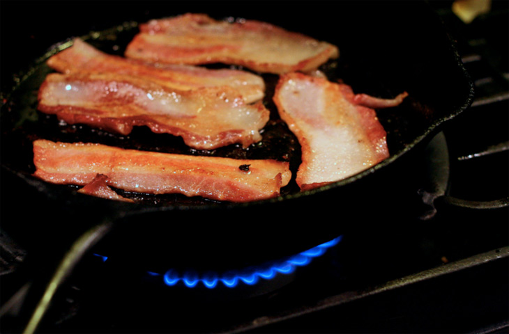 Бекон — это мясной продукт, и как всякое мясо он хорошо «уживается» с чугуном. Посуда с тонкими стенками, как, например, алюминиевая для бекона не подходит. Нагревается она слишком быстро, из-за чего бекон скорее сгорит, чем дойдет до готовности. В противовес им чугун равномерно нагревается, хорошо держит тепло, а в качестве бонуса вы получаете натуральную смазку для посуды из растопленного жира бекона, которая будет выполнять функцию защитного покрытия. Для хрустящей, но не горелой корочки огонь должен быть между минимальным и средним, сковороду в процессе приготовления следует периодически двигать c учетом «точек нагрева».