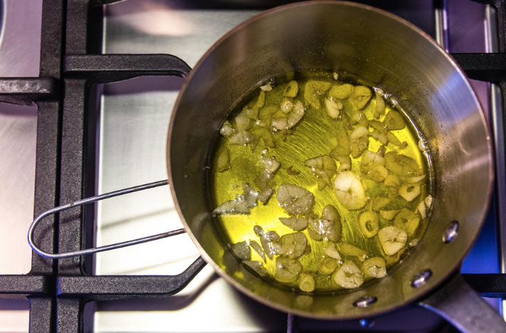 Измельчить чеснок можно разными способами, но то ли из-за нежелания с ним возиться, то ли по привычке обычно он оправляется на доску и нарезается ножом. Однако в отдельных случаях от ножа лучше отказаться и вместо него взять терку. Тертый чеснок получается более мелкий и пушистый, за счет чего он гармоничнее вплетается в состав блюд, где текстура является ключевым показателем, например, в дрессингах или соусе айоли. Если нужен лишь легкий чесночный оттенок, с зубчиком вообще можно ничего не делать, а лишь надавить на него плоской стороной ножа. Добавьте раздавленный зубчик в масло и дайте ему вобрать в себя все ароматы.