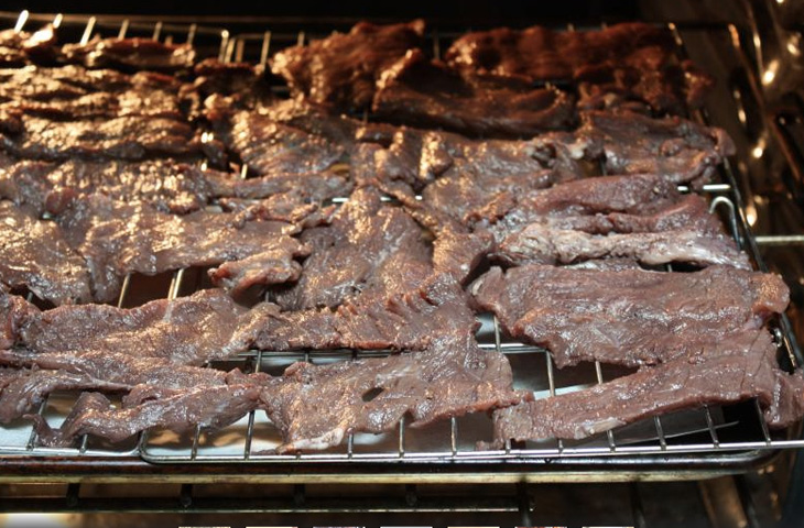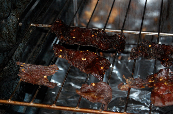 Вся суть приготовления джерки заключается в том, что из мяса нужно удалить влагу. При высоких температурах мясо начнет жариться, поэтому при изготовлении джерки не стоит выходить за пределы 107 °С. В таком низкотемпературном режиме мясо подсушивается около 3-х часов. На готовом джерки не должно быть следов влаги, в противном случае следует остановить мясо еще на какое-то время в духовке, пока они не исчезнут.