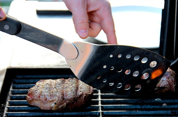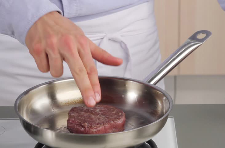 Не трогайте стейк вилкой во время готовки. Все что вы можете с ним сделать — это перевернуть. Проткнув стейк, вы можете разрушить его структуру. Очень важный фактор в приготовлении — дать стейку достичь реакции Майяра (момент, когда поверхность приобретает коричневый оттенок). Добиться этого можно, оставив стейк жариться без всякого вмешательства достаточно продолжительное время. Затем возьмите лопатку и переверните мясо. Дайте ему снова достичь реакции Майяра.