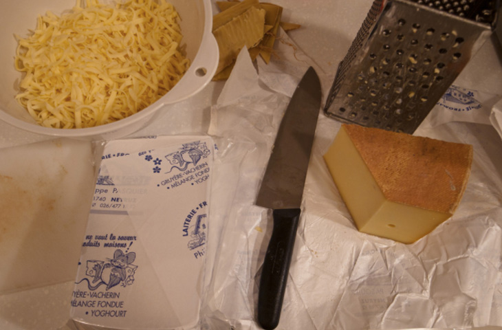 Основа традиционного фондю — это, конечно же, сыр. Классикой жанра считается грюйер, эмменталь, вашеран и аппенцеллер. Самое вкусное фондю получается при смешивании двух сортов: эмменталя и грюйера. Поскольку фондю распространилось далеко за пределы альпийский лугов, допускается заменить «диковинные» сыры на доступные в вашем регионе аналоги. Выбирая сыр для фондю, нужно обращать внимание на то, чтобы он не был слишком твердым и обладал достаточно высокой жирностью. Перед растапливанием сыр нужно натереть (не нарезать!) на терке — так он быстрее и равномернее расплавится.