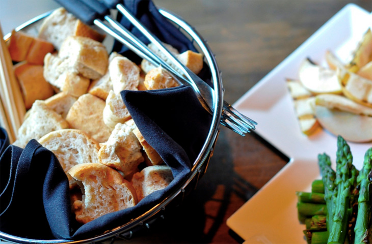 Обычно в фондю макают кусочки хлеба. Вкуснее всего получается подсушенный, но, если вам нравится, можно использовать и свежий. Главное, чтобы он был достаточно плотный, иначе хлеб может соскользнуть в сырную массу, но не настолько, как, например, сухари, поскольку тогда он просто будет крошиться. Хлеб нарезают на порционные кубики или ломают на небольшие кусочки. Швейцарцы сначала макают их в Кирш, а уже потом опускают в густой сырный соус — говорят, так намного вкуснее.