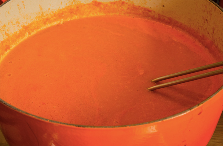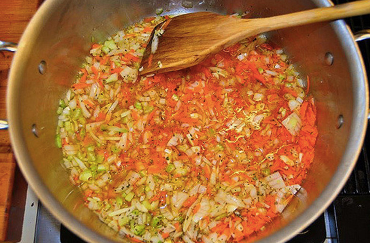 Вкусовой букет супа определяют ароматические добавки. Чтобы получить максимум вкуса от банки томатов, в кастрюлю нужно бросить, к примеру, лук, чеснок, морковь и сельдерей и обязательно пару столовых ложек томатной пасты, которые сделают аромат насыщеннее. Овощи станут основой, такой себе базовой нотой. Жарят их в самом начале, до изменения цвета. Перед тем добавить в суп бульон, не поленитесь деглазировать кастрюлю после жарки овощей — так вы получите дополнительный аромат.