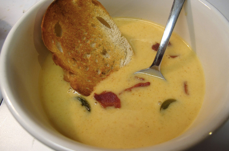 Вернуть бульон обратно в жаровню и довести до медленного кипения на средне-низком огне. Добавить пиво, сливочный сыр и по горсти за раз чеддер, мешая постоянно, пока сыр не расплавится и не образует однородную, гладкую массу. По мере необходимости регулировать огонь, не давая супу кипеть.