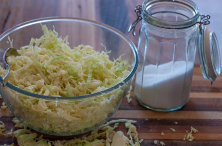 Природный сахар способствует выделению молочной кислоты, содержащей те самые бактерии — катализаторы реакции, а соль помогает вытянуть из капусты соки. В естественном рассоле с кислой средой без доступа кислорода они начинает быстро развиваться, а все вредные бактерии погибают. Соли не должно быть слишком много, поскольку она замедляет процесс брожения, но и не слишком мало, иначе капуста будет излишне мягкой. Золотой серединой считается 20-25 грамм соли на 1 кг капусты.