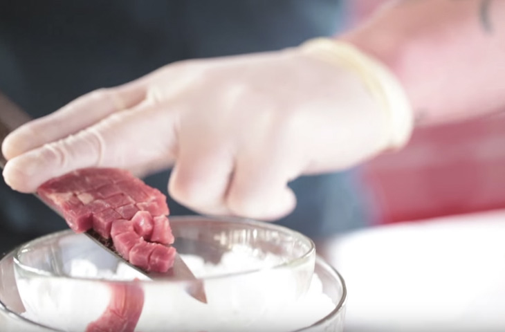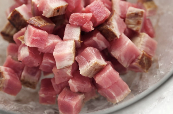 Кубики мяса сразу же переложить в миску, установленную над миской большего размера, заполненной льдом.
