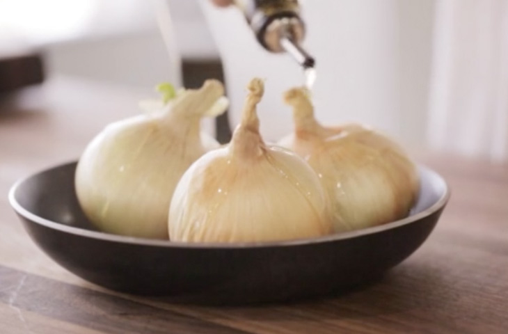 В жаропрочную сковороду положить 3 большие луковицы и щедро полить их оливковым маслом.