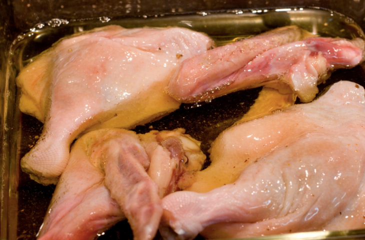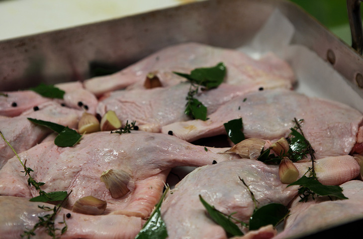 Конфи представляет собой двухступенчатый процесс. На первом этапе мясо приправляют солью, травами и другими ароматическими добавками по собственному усмотрению и оставляют мариноваться хотя бы час. В идеале — от 24 до 36 часов. Пока мясо спокойно себе лежит, соль будет вытягивать лишнюю влагу, а травы — пропитытают его тонкими ароматами.
