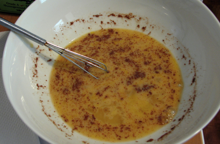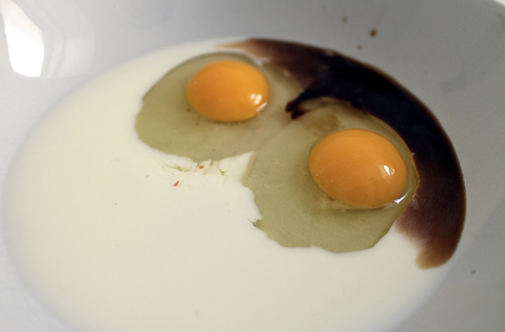 Пары взмахов вилкой или венчиком вовсе не достаточно, чтобы яйца и молоко превратились в однородную массу. Смесь необходимо тщательно взбивать до тех пор, пока все ингредиенты, включая сахар и специи, если они используются, хорошо не смешаются между собой до получения гладкой, однородной массы.