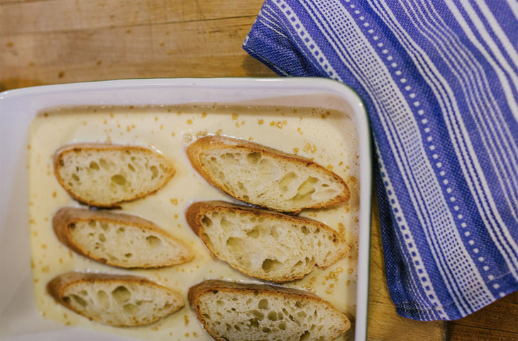 Жидкое «тесто» из молока и яиц должно хорошо пропитать тосты. Если хлеб будет излишне пористый или тонкий, булка быстро размокнет; при использовании слишком плотного хлеба или толстых ломтиков — внутри тосты останутся сухими. Вымачивание 2,5-сантиметровых ломтиков хлеба с правильной текстурой занимает от 5 до 10 минут. Для этого хлеб погружают с яично-молочную смесь, оставляют на какое-то время, после чего переворачивают и ждут, когда хорошо пропитается вторая сторона.