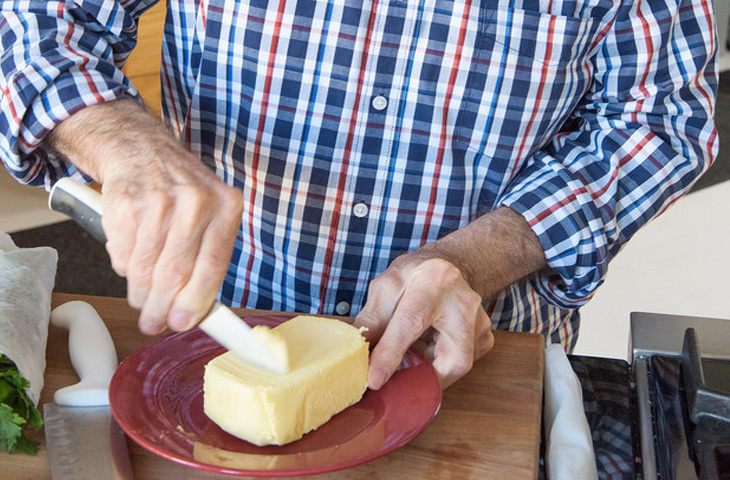 Поставьте сковороду на средний огонь и положите примерно 2 столовые ложки несоленого, сливочного масла. Когда масло растопится, а произойдет это за считанные секунды, вращая сковороду, распределите его по поверхности.