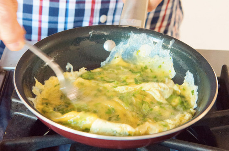 С этого момента омлет необходимо постоянно мешать, «собирая» яичную массу с боков и со дна, и перекладывая ее в центр. При этом сковороду периодически нужно еще и встряхивать, не прекращая мешать омлет вилкой.
