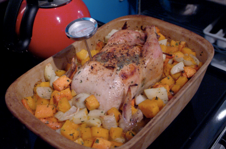Самый простой способ избежать пересушивания курицы — воспользоваться термометром. Не нужно изобретать никакой велосипед, достаточно ближе к концу приготовления вставить его в мясо и измерить внутреннюю температуру. Иногда даже если при надрезе курицы выступает розоватый сок, на самом деле мясо уже может быть готово, и продолжая термическую обработку, вы его просто пересушите. Термометр позволяет приготовить мясо до безопасной внутренней температуры и сохранить его сочность. Для грудок оптимальная температура прожарки составляет 74 °C, для бедер от 74 °C до 79 °C.