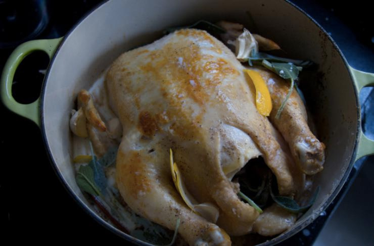 Положить курицу обратно в кастрюлю с остальными ингредиентами. Поставить кастрюлю, частично или полностью прикрытую крышкой, в предварительно разогретую духовку. Запекать примерно 1,5 часа, периодически поливая птицу жидкостью из кастрюли.
