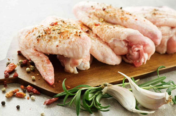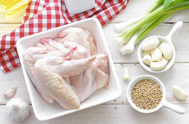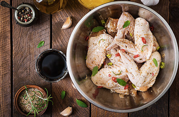 Достать миску с крыльями из холодильника и дать им время слегка согреться, пока они не дойдут до температуры ближе к комнатной, это займет не меньше 15 минут. Этот шаг необходим для того, чтобы крылышки готовились равномерно.