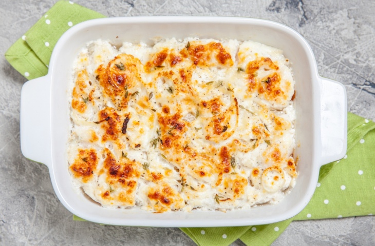 Это блюдо требует внимательного обращения при запекании. Гратену подходит двухтемпературный режим. Сначала духовку нужно разогреть до 150 градусов Цельсия и запекать картофель примерно полтора часа. Молоко и сливки при такой низкой температуре испытывают превращение медленно и постепенно, а картофель становится не просто вареным, а нежным и пропитанным соусом. При более высоких температурах молочная смесь просто закипит и выпарится раньше времени. Затем на гратен высыпается сыр, и тогда температуру можно увеличить, чтобы образовалась румяная корочка.