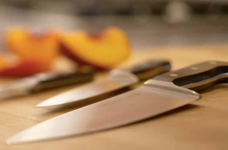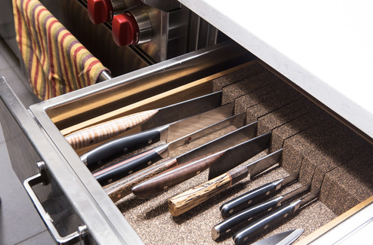 Хранить кухонные ножи необходимо отдельно от вилок, ложек и прочего кухонного инвентаря. Контакт с другими предметами будет способствовать лишь более быстрому затуплению лезвия. Для хранения ножей оптимально подходят магнитные держатели или специальный лоток, вставленный в ящик кухонной мебели. Блок для ножей — не самая практичная в хозяйстве вещь: он будет только занимать место, к тому же некоторыми ножами вы будете пользоваться в лучшем случае пару-тройку раз в год. Минимальный набор ножей для комфортной работы на кухне состоит из трех ножей: ножа шефа, ножа с зубьями на режущей кромке и ножа для чистки и нарезки овощей.