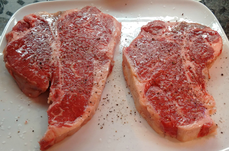 Стандартным набором специй для хорошего стейка является черный перец грубого помола и кошерная соль. Веточка розмарина или тимьяна также будут кстати. Все остальное будет явным излишеством — вкус специй может перебить аромат стейка. Вы можете использовать смесь сушеной зелени — она также подойдет. Солить кусок мясо нужно заранее. 15 минут хватит, чтобы кристаллы соли растворились и впитались в волокна.