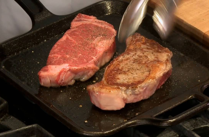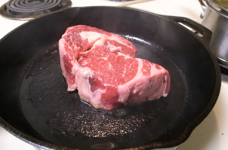 Стейк можно и нужно готовить на чугунной сковороде, но ее следует сначала предварительно подготовить. Вам не понадобится масло. Того, что есть на стейке будет достаточно для приготовления. Сковороду нужно раскалить на среднем огне. Проверить температуру чугуна можно дедовским способом — капнув воды на поверхность. Если капля танцует, шипит и испаряется за пару секунд, значит сковорода достаточно нагрелась.