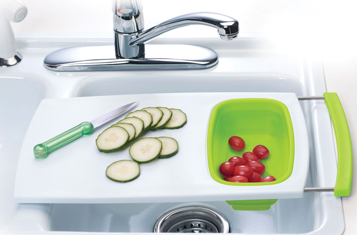 Такая уже давно придумана и может создать дополнительное рабочее пространство прямо над кухонной мойкой. Заодно, такая доска избавит от необходимости мыть стол вокруг доски после нарезания чего-нибудь мелкого. -