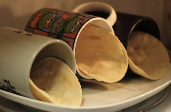 Если продукт немного передержать, то какое-то время он будет оставаться настолько горячим, что его нельзя будет взять в руки. В случае с небольшими лепешками этот вопрос легко можно решить с помощью кружек. Лепешки следует положить в кружки, расположить их на тарелке и отправить в микроволновку на одну минуту. Чтобы извлечь их, достаточно будет взяться за ручку кружки и перевернуть ее над тарелкой. Таким образом за раз можно подогреть несколько лепешек и достать их, не обжегшись.
