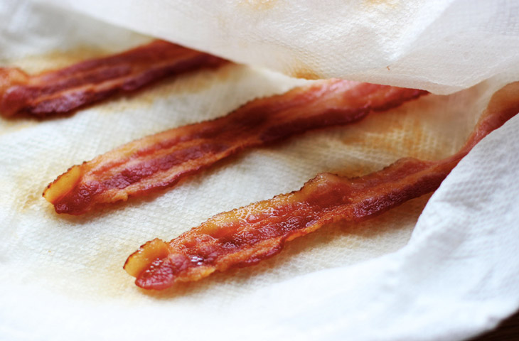 Хрустящий бекон можно приготовить даже без масла и сковороды. Для этого необходимо положить на тарелку бумажное полотенце, сверху разложить несколько ломтиков бекона, обычно берут около 5 штук, прикрыть их бумажным полотенцем и поставить в печь. Время приготовления рассчитывается исходя из пропорции: одна минута на один ломтик, если подрумяниваются небольшие, тонкие куски. На более толстые необходимо закладывать несколько больше времени.