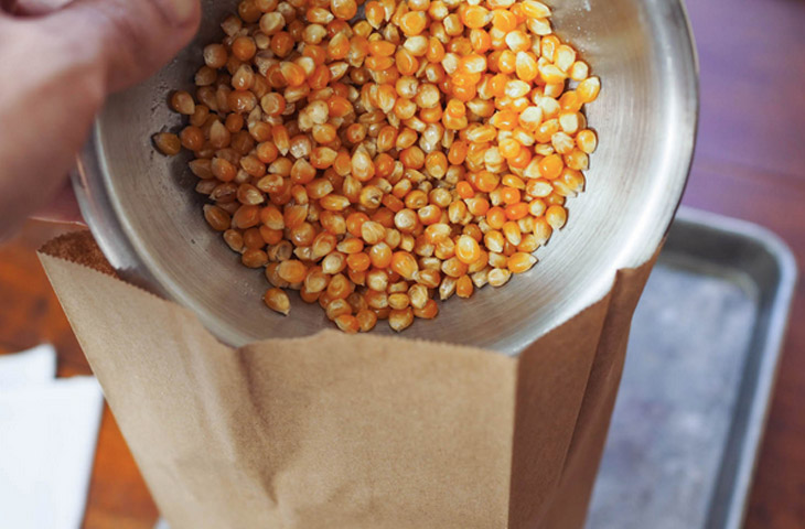 Из специального сорта кукурузных зерен в микроволновой печи можно приготовить попкорн. Достаточно засыпать в маленький бумажный пакет 1/2 кружки зерен, политых 1/2 ч.л. оливкового масла, свернуть несколько раз верх пакета и поставить его на 3 минуты в микроволновку.