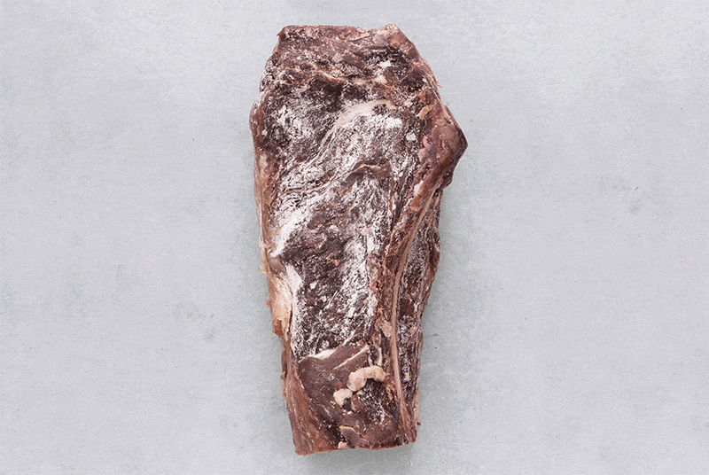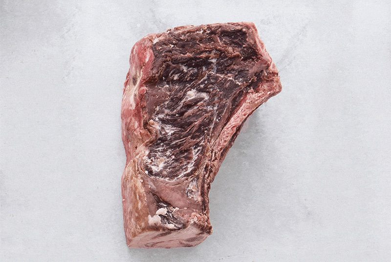 В мясе только начал разрушаться коллаген и пока оно сохраняет довольно яркий красный цвет. Вкус такой говядины еще далек от того, который характерен для стейков сухой выдержки. За счет кости — а для выдержки подходят только стейки на кости — мясо держит форму. Мясо 7-дневной выдержки не выставляют на продажу.