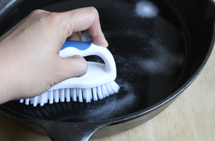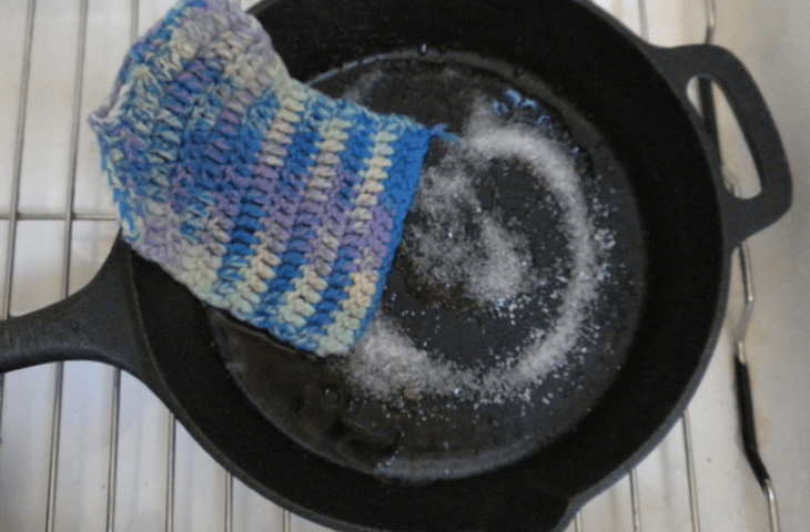 Посуда из чугуна требует регулярного ухода. После каждого использования ее необходимо тщательно мыть, вытирать насухо и наносить на ее поверхность тонкий слой растительного масла. Жир и пригоревшие остатки пищи лучше всего очищаются с чугунной сковороды пока она еще горячая. Перед мытьем посуды излишки масла удаляются бумажной салфеткой. Далее в сковороду необходимо налить горячую воду, добавить немного соли и вымыть ее мягкой нейлоновой мочалкой.