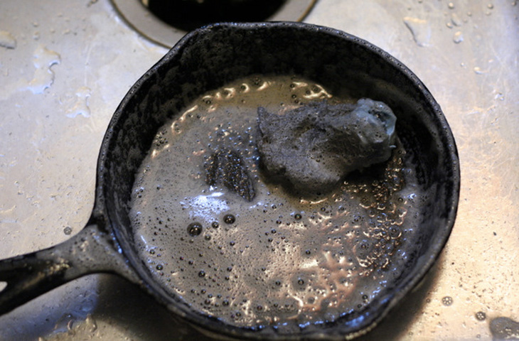 При очистке старого нагара понадобится тяжелая артиллерия в виде средства для чистки духовок и сильно загрязненных поверхностей. Средство наносят на чугунную посуду и оставляют ее «для отмачивания» от часа до нескольких часов, в зависимости от того, насколько застарелый нагар. Остатки масла и жира необходимо очистить жесткой щеткой. В конце сковороду споласкивают горячей водой и насухо высушивают.
