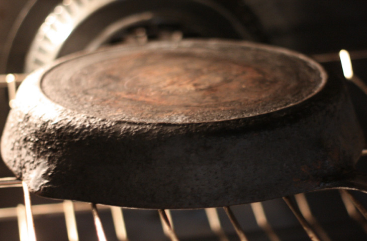 Если на чугунной посуде начали появляться пятна, ржавчина, к стенкам пригорает еда, посуду следует повторно прокалить. Перед тем как нагреть сковороду, необходимо очистить ее от ржавчины, вымыть в горячей мыльной воде и высушить. Сначала сковороду прокаливают без масла при 100 °C в течение 20-30 минут. Затем посуду остужают, смазывают растительным маслом и снова отправляют в духовку, разогретую уже до 180 °C, и оставляют на 1 час. Прокаленную сковороду вытирают насухо и смазывают тонким слоем масла.