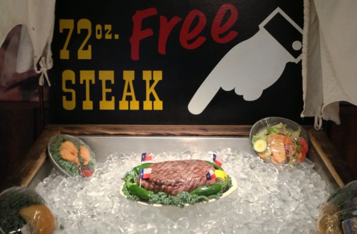 Заведение Big Texan Steak Ranch Challenge в Амарилло несколько лет назад бросило вызов всем любителям стейков. За час они предлагают расправиться с 2х килограммовым стейком, креветочным коктейлем, салатом, жареной картошкой и булочкой. Если участник фудмарафона справляется с заданием — все съеденное за счет заведения. В противном случае аутсайдер должен будет заплатить 72 доллара.
