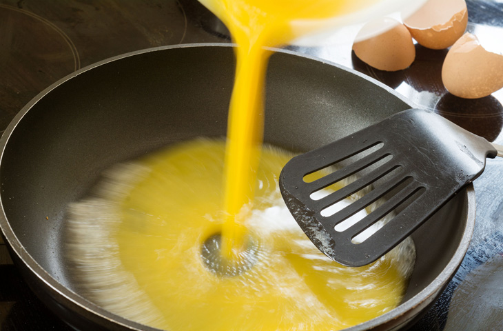 Яйца — не только самый дешевый белковый продукт, как было сказано во вступлении, но и довольно нежная субстанция. На быстром огне вы получите не болтунью, а кусок строительной пены — жесткой и сухой. Поэтому настройте конфорку в промежутке от слабого до среднего значения, и блюдо получится мягким, как заварной крем.