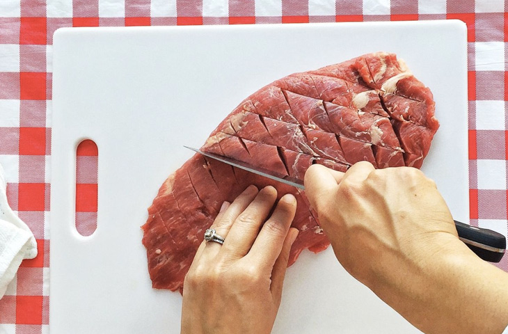 Данный способ обработки просто необходим при подготовке альтернативных отрубов, если вы не используете тендерайзер. Разрушая жесткую структуру, надрезы поперек волокон делают мясо мягче. Помимо этого наносятся они для того, чтобы мясо быстрее прожарилось, а его прожарка была равномерной. Если при приготовлении используется какой-либо маринад, то он сможет глубже проникнуть внутрь и передать мясу свой аромат. Для тех, кто только открыл для себя стейк и еще не обзавелся термометром, надрезы помогут контролировать степень прожарки.