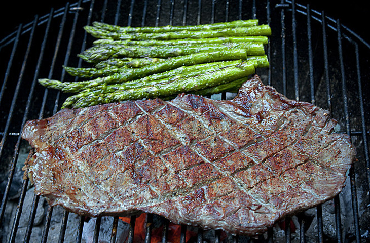 После получения равномерной сетки из ромбиков мясо натирается смесью приправ и отправляется на гриль. Обжаривается стейк так же, как и обычно, до желаемой степени прожарки. Рассчитывая время приготовления, стоит учесть, что за счет «рисунка» из ромбиков жар будет быстрее проникать к центру куска, что сократит время приготовления.